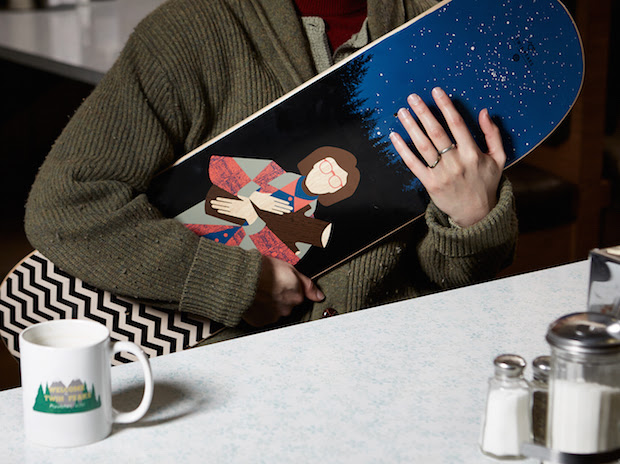 Want a skateboard deck with Dale Cooper, Laura Palmer, Audrey Horne, or the Log Lady on the bottom? Here’s your chance: David Lynch has teamed up with Habitat Skateboards for a new “Twin Peaks” line. The new skate decks feature several designs inspired by scenes and images from the iconic show. Other items in the collection include pins, mugs, shirts, and more. Check out the designs below, and find out more info about the collection here. “Twin Peaks” makes its return to Showtime on May 21.
